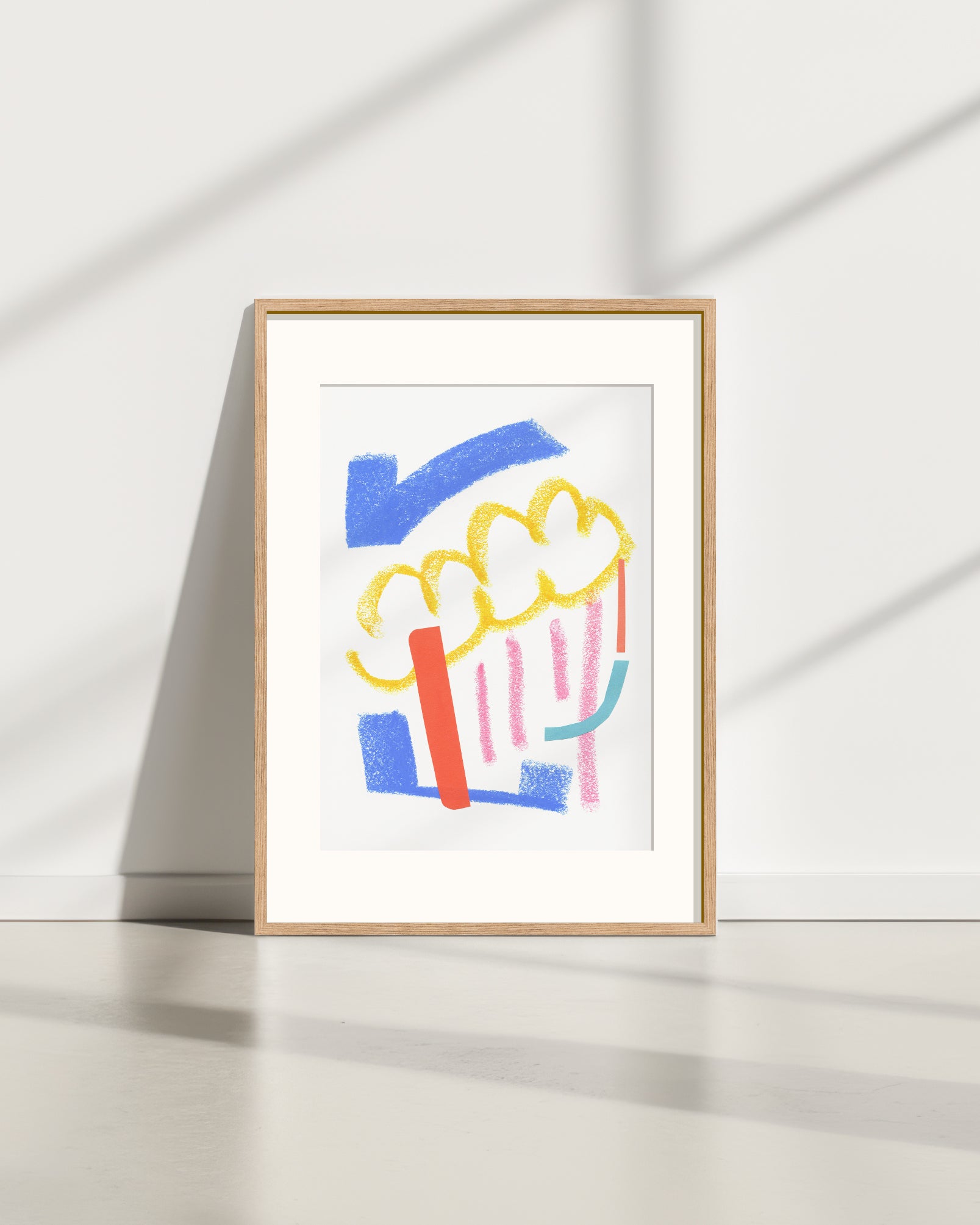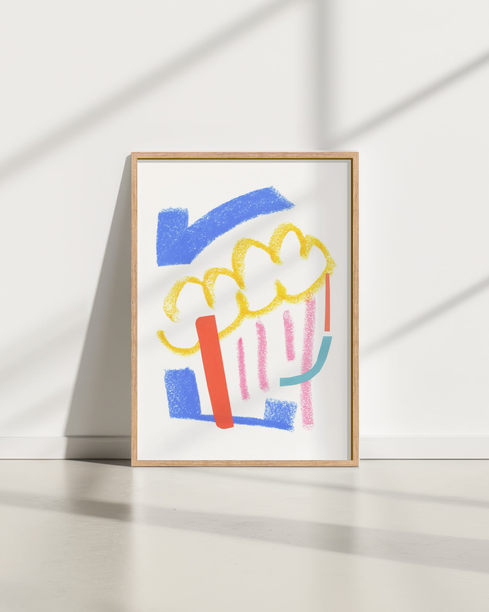 Elke print in deze serie begint met een flowsessie. Abstracte vormen en kleuren die intuïtief en op gevoel met pastelkrijt op papier worden gezet. Daarna voeg ik de tweede laag papieren collage-elementen toe, totdat er voor mij een compositie ontstaat die klopt.