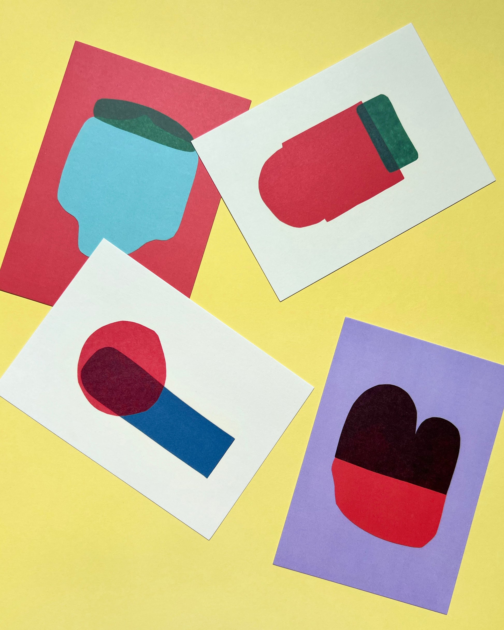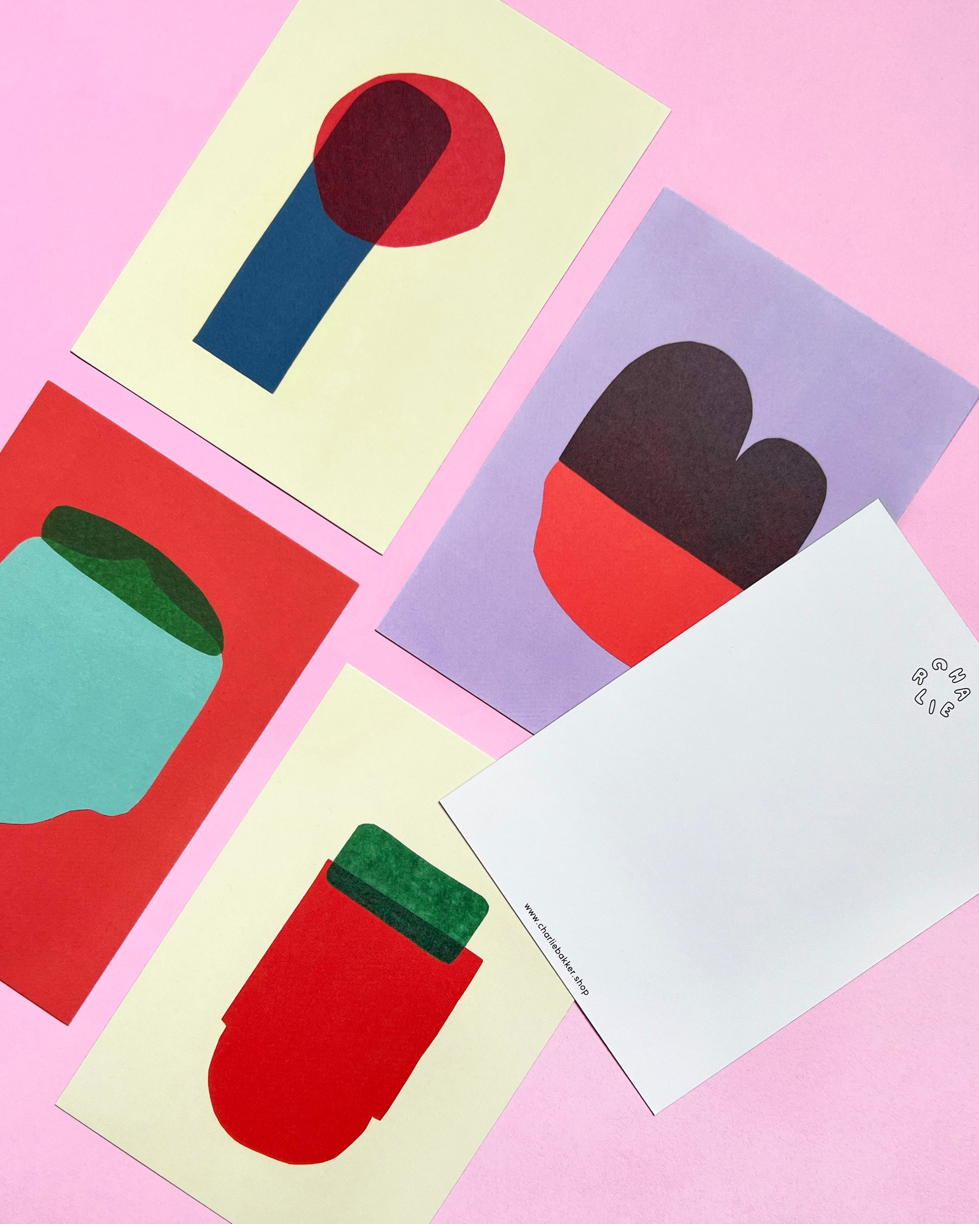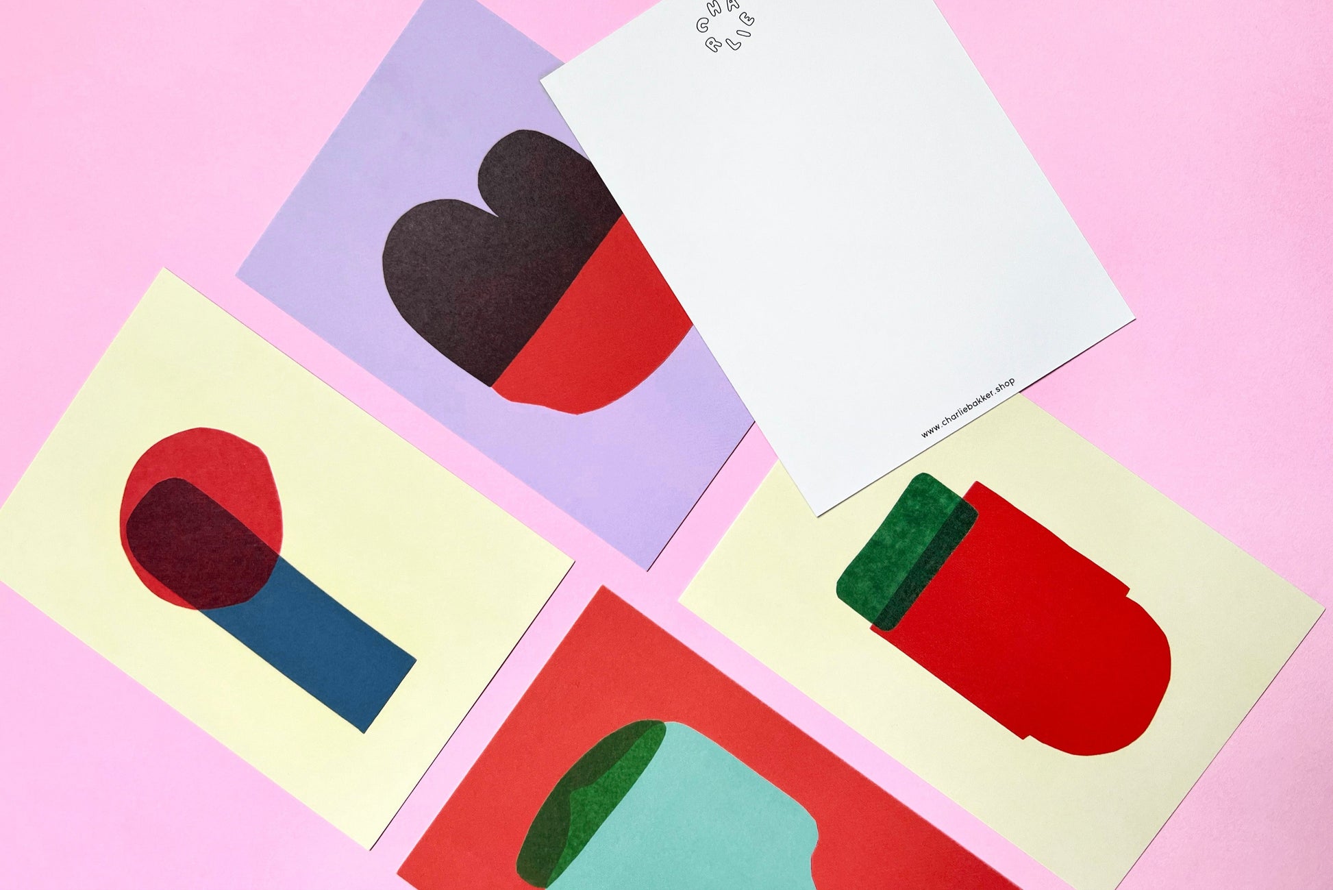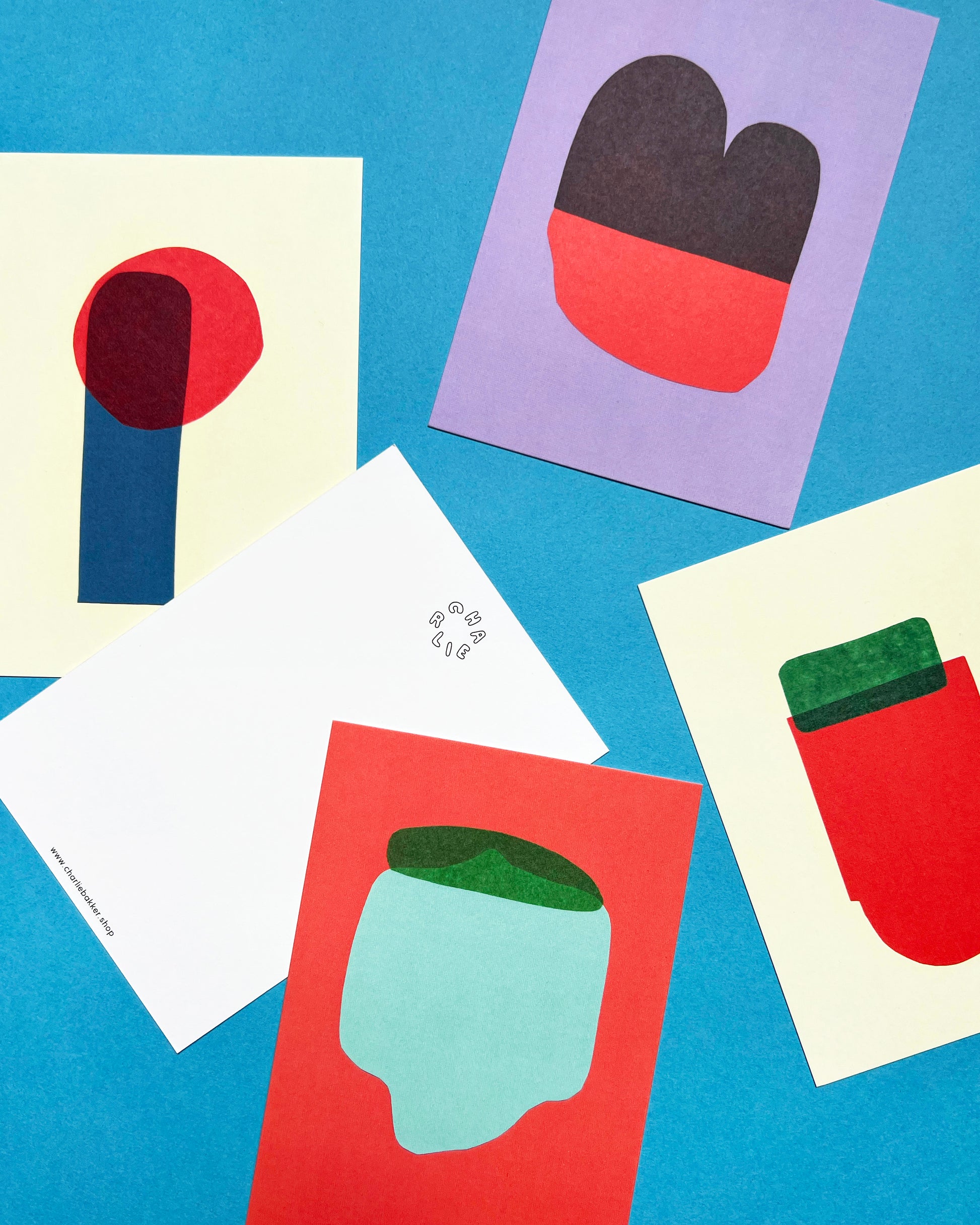 Set van 4 kaarten op A6-formaat, gedrukt op 300g Bio Top papier.