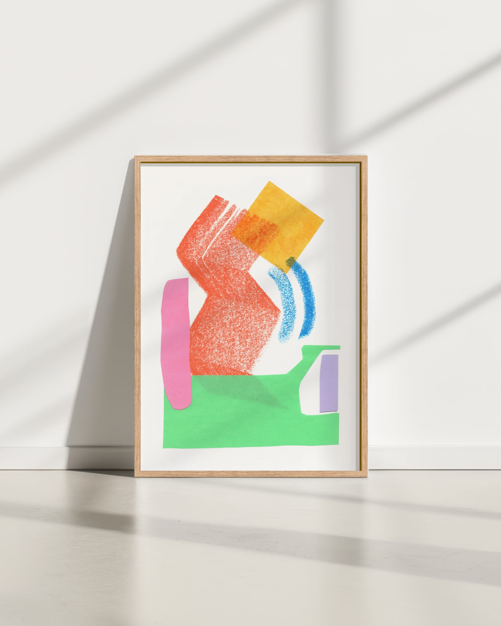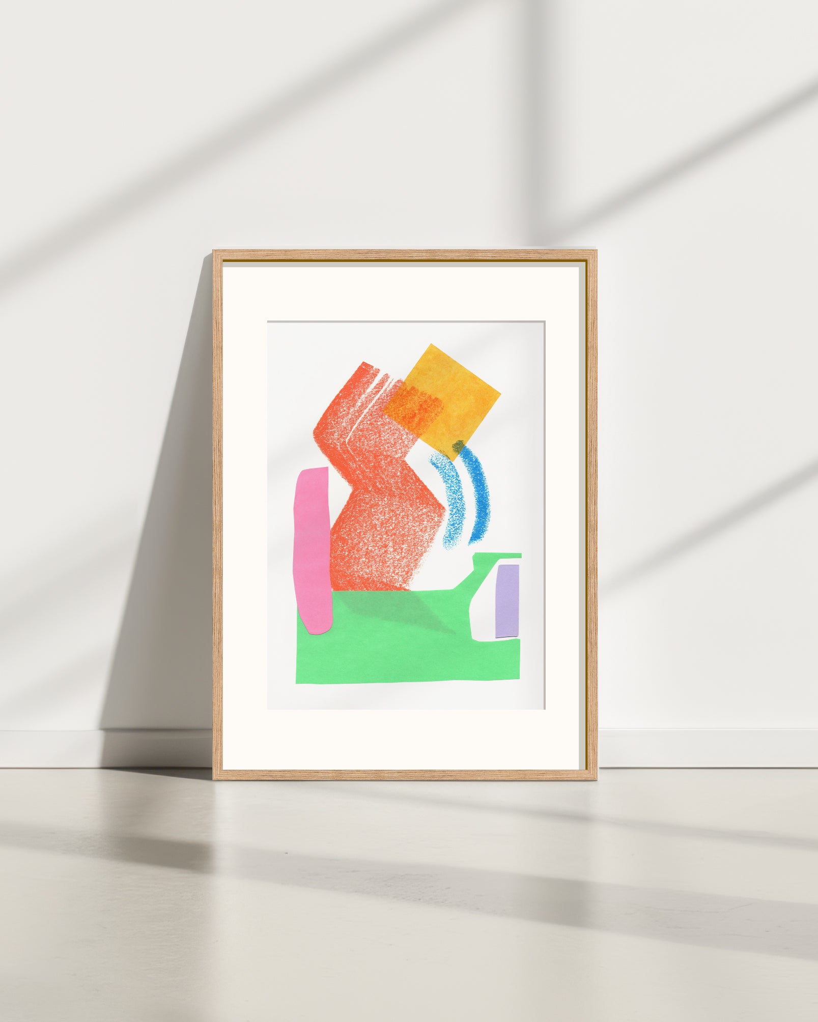 Elke print in deze serie begint met een flowsessie. Abstracte vormen en kleuren die intuïtief en op gevoel met pastelkrijt op papier worden gezet. Daarna voeg ik de tweede laag papieren collage-elementen toe, totdat er voor mij een compositie ontstaat die klopt.